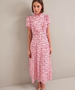 Mirabel Gold Metallic Fil Coupé Maxi Dress – Pink Floral Trellis Print