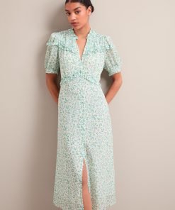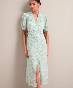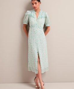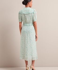 Viola Gold Metallic Fil Coupé Midi Dress – Green Yellow Trailing Feather Print